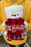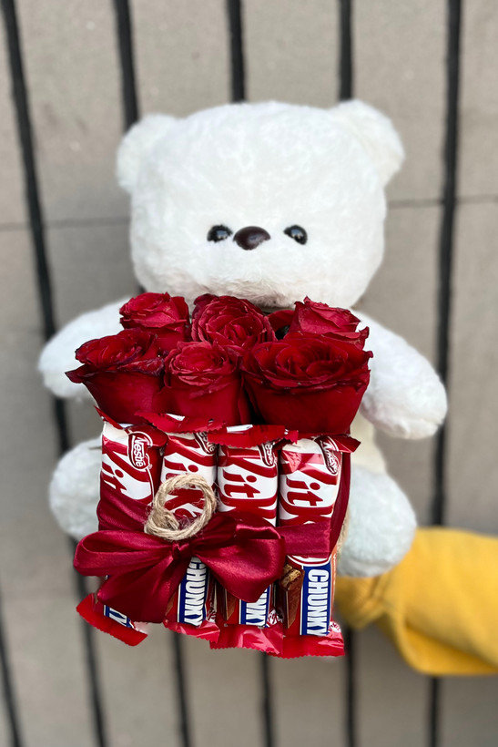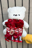 خرس سفید تزئین شده با گل رز طبیعی و شکلات خارجی کیت کت🐻❄️🍫🌹