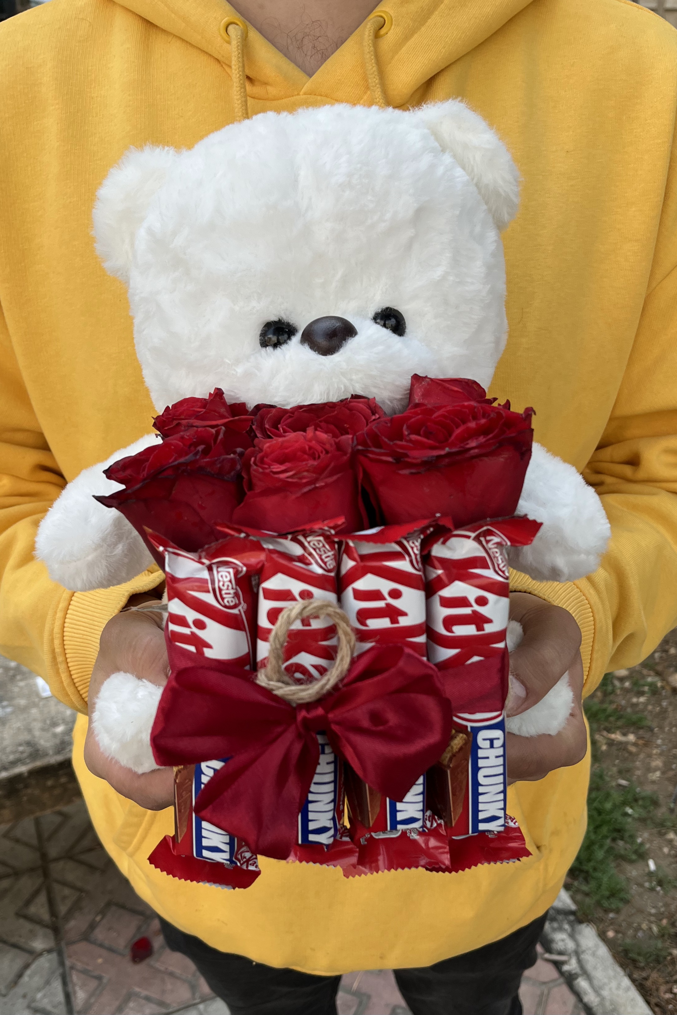 خرس سفید تزئین شده با گل رز طبیعی و شکلات خارجی کیت کت🐻❄️🍫🌹